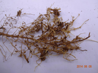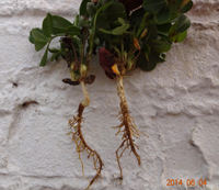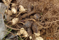 癥狀:花生根結(jié)線蟲病主要為害植株的地下部,因地下部受害引起地上部生長(zhǎng)發(fā)育不良。幼苗被害,一般出土半個(gè)月后即可表現(xiàn)癥狀,植株萎縮不長(zhǎng),下部葉變黃,始花期后,整株莖葉逐漸變黃,葉片小,底葉葉緣焦灼,提早脫落,開花遲,病株矮小,似缺肥水狀,田間常成片成窩發(fā)生。雨水多時(shí),病情可減輕。