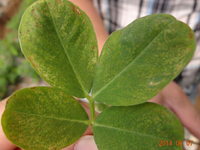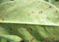 癥狀:花生銹病在各個(gè)生育階段都可發(fā)生,但以結(jié)莢期以后發(fā)生嚴(yán)重。主要侵染花生葉片,亦可為害葉柄、托葉、莖稈、果柄和莢果。葉片染病初在葉片正面或背面出現(xiàn)針尖大小淡黃色病斑,后擴(kuò)大為淡紅色突起斑,表皮破裂露出紅褐色粉末狀物,即病菌夏孢子。下部葉片先發(fā)病,漸向上擴(kuò)展。葉上密生夏孢子堆后,很快變黃干枯,似火燒狀。葉柄、托葉、莖、果柄和果殼染病夏孢子堆與葉上相似,托葉上的夏孢子堆稍大;葉柄、莖和果柄上的夏孢子堆橢圓形,長(zhǎng)1~2mm,但夏孢子數(shù)量較少。