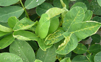 癥狀:花生出苗后即見發(fā)病。初在頂端嫩葉上現(xiàn)褪綠黃斑,葉片卷曲,后發(fā)展為黃綠相間的黃花葉、網(wǎng)狀明脈和綠色條紋等癥狀。病害發(fā)生后期癥狀有減輕趨勢(shì)。