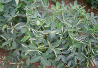 癥狀:(1)葉片:發(fā)病,病斑暗褐色,近圓形,直徑3~8毫米,具不明顯輪紋。潮濕時(shí),病斑呈水漬狀軟化腐爛。(2)莖部:莖部發(fā)病,病斑初為褐色,后變?yōu)樯詈稚,最后呈黑褐色。造成莖桿軟腐,植株萎蔫枯死。在潮濕條件下,病斑上布滿灰褐色絨毛狀霉?fàn)钗锖突野咨蹱钗,即病菌菌絲、分生孢子梗和分生孢子;ㄉ鷮⒔斋@時(shí),莖的皮層及木質(zhì)部之間產(chǎn)生大量小菌核,有時(shí)菌核能突破表皮外露。(3)果針:果針受害后,收獲時(shí)易斷裂。(4)莢果:莢果受害后變?yōu)楹稚,在表面或莢果里生白色菌絲體及黑色菌核,引起子粒腐敗或干縮。大菌核病引起癥狀和小菌核病相似,但僅在莖蔓上發(fā)生,后期產(chǎn)生菌核較大。