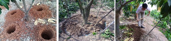 為了促進芒果根系正常生長和再生,在不同時期應對果園做深耕和翻土處理。冬季(或采果修剪后)應結(jié)合深翻改土,沿樹冠垂直線下挖(60cm深、30cm寬)環(huán)溝、對溝或圓形溝,切斷土壤下層的粗根,經(jīng)曬五、六天,然后施采果肥,用表土和植物殘體加以回填。結(jié)合清園,進行中耕翻土(20cm深),以切斷表土的吸收根,減弱地下部分對地上部分水分和養(yǎng)分輸送,有利地上部分營養(yǎng)物質(zhì)積累,促進花芽分化。