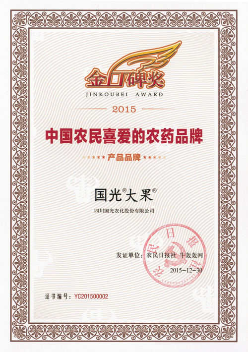 “2015中國(guó)農(nóng)民喜愛(ài)的農(nóng)藥品牌”大型公益調(diào)查活動(dòng)在2015年10月22日啟動(dòng),通過(guò)農(nóng)民日?qǐng)?bào)等機(jī)構(gòu)調(diào)查,國(guó)光“大果”榮獲2015中國(guó)農(nóng)民喜愛(ài)的農(nóng)藥品牌稱(chēng)號(hào)。