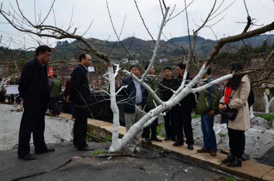 專家領(lǐng)導(dǎo)們?cè)趪狻岸Wo(hù)”桃樹基地觀摩