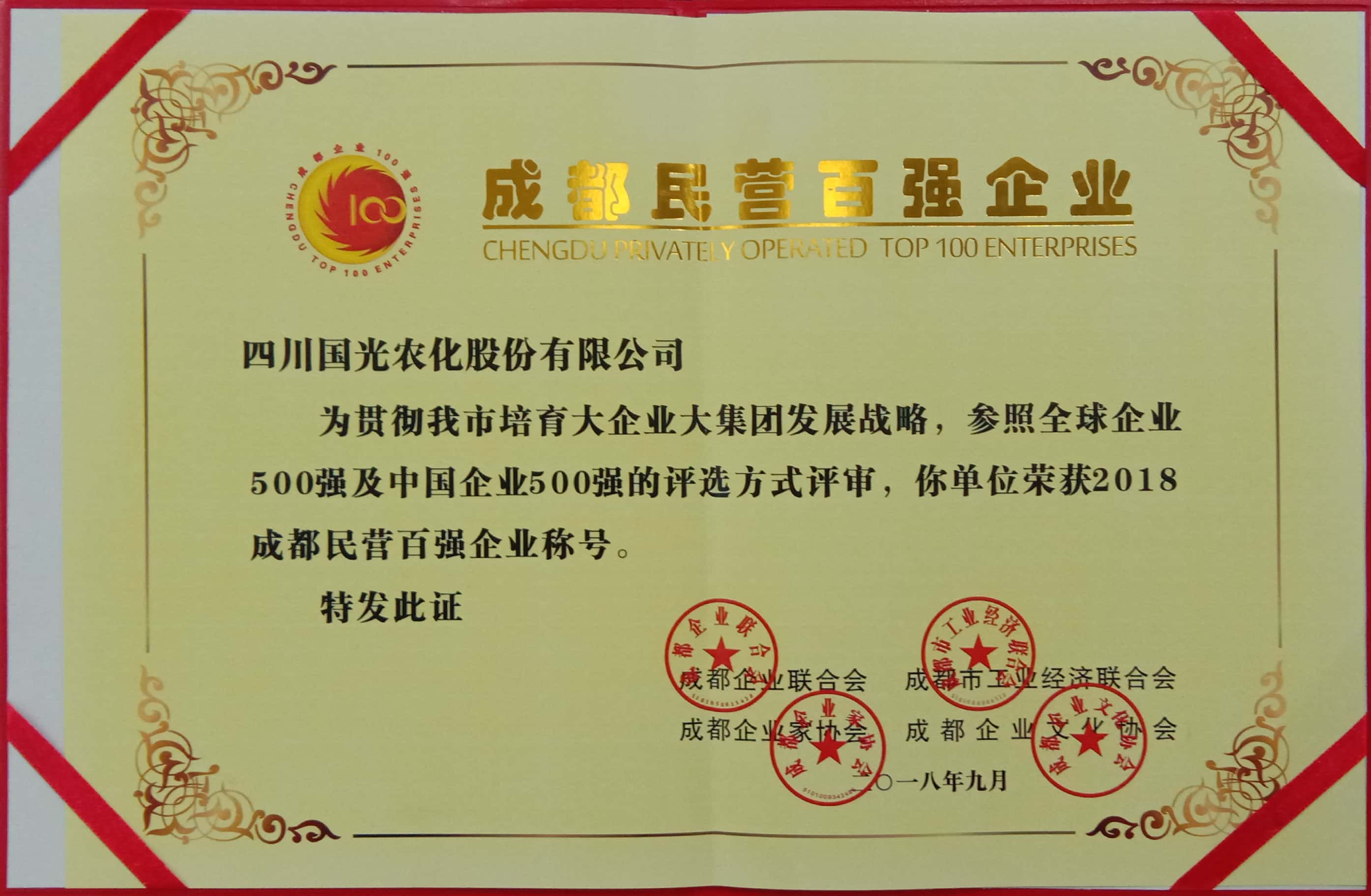 國光股份憑借優(yōu)異經(jīng)營業(yè)績和強勁增長勢頭,獲得“2018成都企業(yè)100強”榮譽稱號。