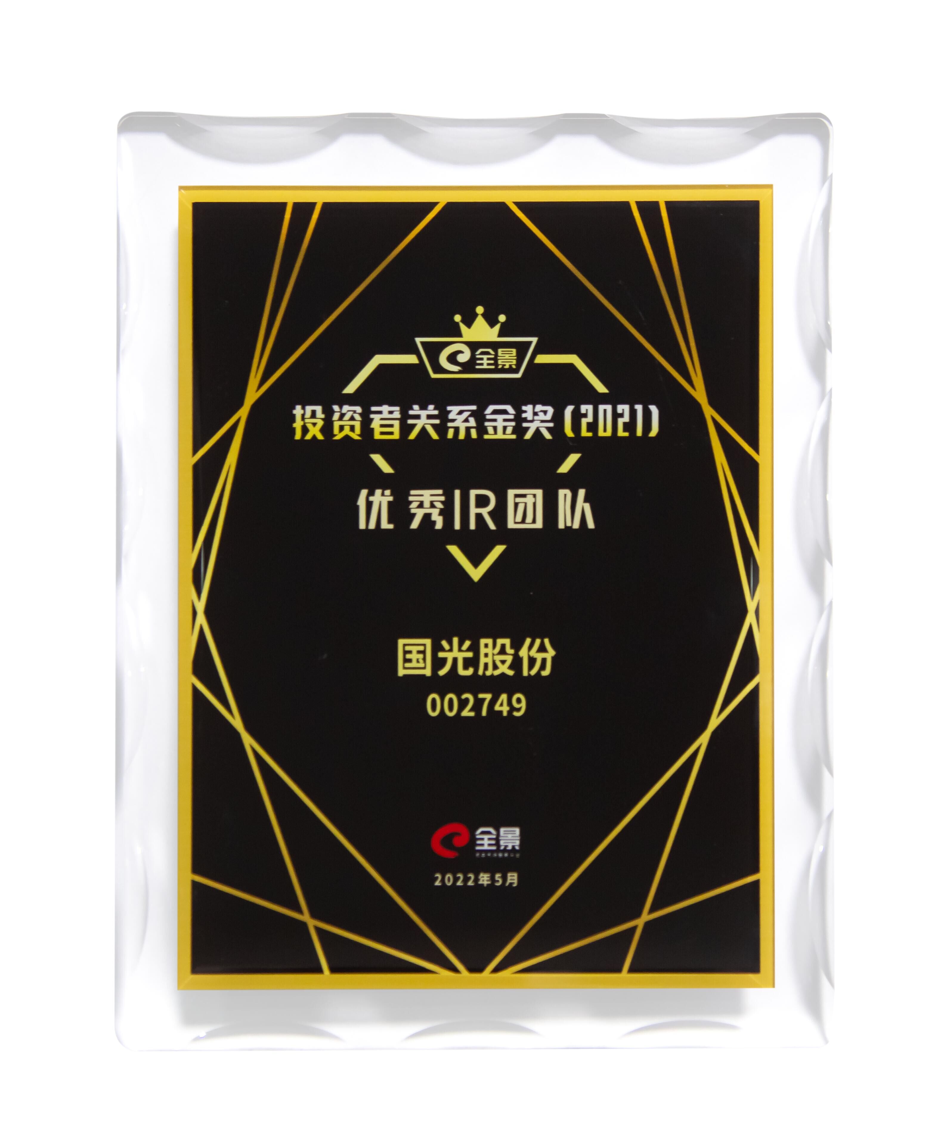 2022年5月13日,由深圳市全景網(wǎng)絡(luò)有限公司主辦、南開大學(xué)中國(guó)公司治理研究院參與推出的“全景投資者關(guān)系金獎(jiǎng)”2021年度全國(guó)性評(píng)選,經(jīng)過(guò)專家顧問(wèn)組最后環(huán)節(jié)的評(píng)審,獲獎(jiǎng)榜單正式揭曉!國(guó)光股份(002749)榮獲“優(yōu)秀IR團(tuán)隊(duì)”獎(jiǎng)項(xiàng)!