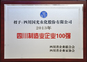 2013年11月19日,四川省企業(yè)聯(lián)合會(huì)、四川省企業(yè)家協(xié)會(huì)在成都金牛賓館召開2013四川企業(yè)100強(qiáng)、四川制造業(yè)企業(yè)100強(qiáng)、四川服務(wù)業(yè)企業(yè)50強(qiáng)發(fā)布暨企業(yè)發(fā)展峰會(huì),四川國(guó)光農(nóng)化股份有限公司榮獲四川制造業(yè)企業(yè)100強(qiáng)。