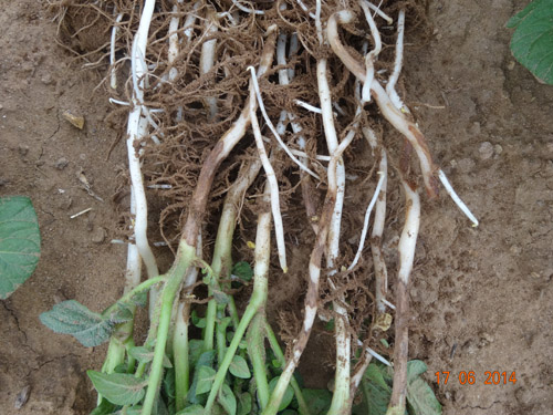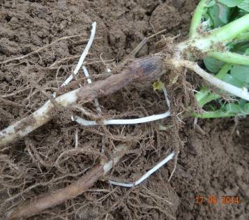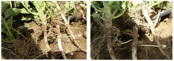 試驗背景:隨著馬鈴薯面積的擴大,連作障礙土傳性病害越來越嚴(yán)重,特別是像黑痣病、枯萎病近2年發(fā)生特別嚴(yán)重,而且治療非常困難。市面上防治這類病害的藥劑效果好的很少。2014年由于前期地溫比較低、濕度大,黑痣病感染比較嚴(yán)重,有的甚至已經(jīng)感染匍匐莖,嚴(yán)重影響到馬鈴薯的生長。