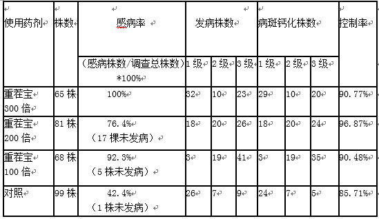2、 用藥處理后,大多數(shù)植株病斑已鈣化,病情發(fā)展得到控制,其中重茬寶200ml/畝控制率達(dá)到96.42%,其中對發(fā)病較輕的植株(1級、2級)控制率達(dá)到100%。