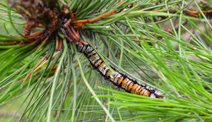 松毛蟲繁殖力強(qiáng),產(chǎn)卵量大,卵多成塊或成串產(chǎn)在未曾受害的幼樹針葉上。1-2齡幼蟲有群集和受驚吐絲下垂的習(xí)性;3齡后受驚擾有彈跳現(xiàn)象;幼蟲一般喜食老葉。成蟲有趨光性,以20時(shí)活動(dòng)最盛。